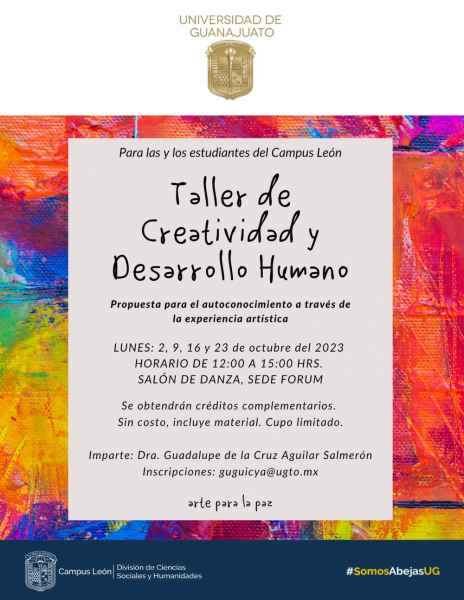 En la Sede Forum en León se presentará el “Taller de creatividad y desarrollo humano” por la Dra. Guadalupe de la Cruz este 16 y 23 de octubre a las 12:00 horas; y el taller de baile “¡A todo ritmo UG!” el 20 y 27 de octubre a las 13:00 horas.