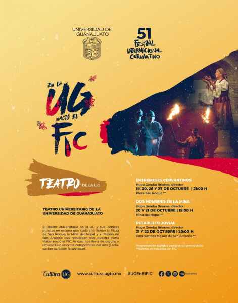 Guanajuato, Gto., a 13 de octubre de 2023.- La Universidad de Guanajuato (UG) está lista para la edición 51 del Festival Internacional Cervantino (FIC) con actividades teatrales, musicales, dancísticas y artes visuales, además de ofrecer de manera continua actividades culturales en los diversos espacios universitarios.