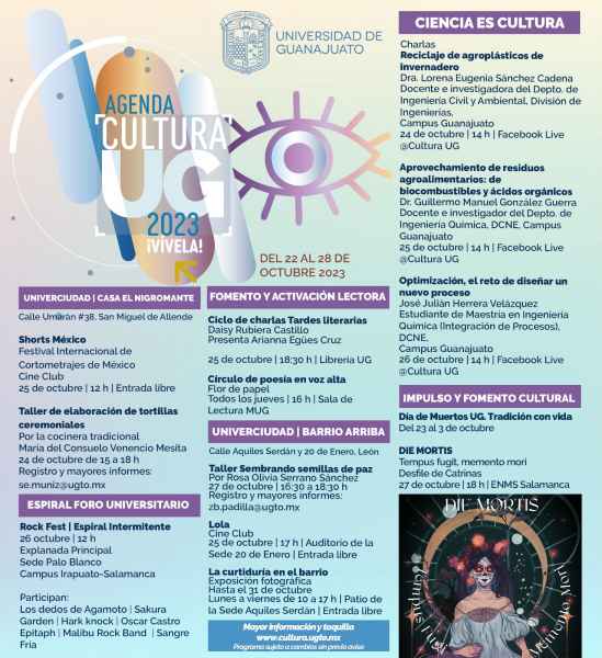 El ciclo de charlas “Tardes Literarias” continua con sus actividades para examinar la obra de Daisy Rubiera Castillo. Dicha ponencia se llevará a cabo el 25 de octubre a las 18:30 horas en la Librería UG. Adicionalmente a ello, el Circulo de Poesía en Voz alta presenta “Flor de Papel”, mismo que sesiona todos los jueves en punto de las 16:00 horas en la Sala de Lectura del Museo de la Universidad de Guanajuato. A su vez, el Club Universitario de Ajedrez exhorta a los interesados a unirse a sus sesiones de practica y estudio #TeTocaMover, los días lunes y miércoles de las 17:00 a las 20:00 horas en el Mesón de San Antonio.