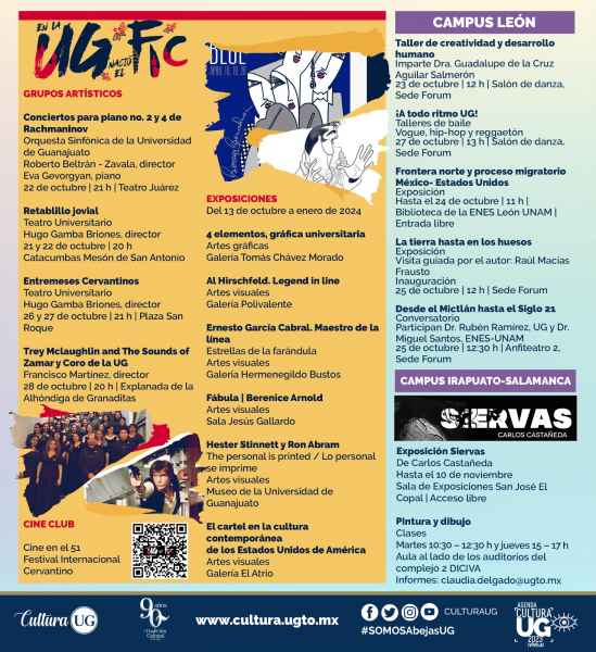 En el Campus León, la Dra. Guadalupe de la Cruz Aguilar impartirá el “Taller de Creatividad y Desarrollo Humano”, este 23 de octubre a las 12:00 horas en el Salón de Danza de la Sede Fórum. Asimismo, para aprender diversos tipos de baile llega “¡A todo ritmo UG!”, taller que tendrá lugar en el Salón de Danza de la Sede Fórum este 27 de octubre a las 13:00 horas. La exposición fotográfica “Frontera norte y proceso migratorio México- Estados Unidos” mantendrá sus puertas abiertas hasta el 24 de octubre en la Biblioteca de la Escuela Nacional de Estudios Superiores de la ciudad de León (ENES – UNAM) con entrada libre. Paralelo a ello, se realizará la inauguración de la exposición pictórica “La Tierra hasta en los Huesos” con un recorrido guiado por su autor Raúl Macias Frausto, a verificarse el 25 de octubre a las 12:00 horas en la Sede Fórum.