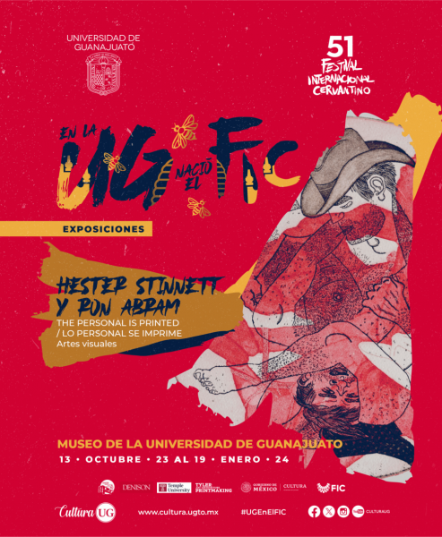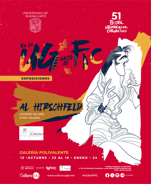 En el marco del 51° Festival Cervantino, las exposiciones: ‘4 Elementos: Gráfica Universitaria’ en la Galería Tomás Chávez Morado; ‘Al Hirschfeld – Leyenda en Línea’ en la Galería Polivalente; ‘Ernesto García Cabral - Maestro de la línea’ en la Galería Hermenegildo Bustos; ‘Fabula’ de Berenice Arnold en la Sala Jesús Gallardo; ‘Lo Personal se Imprime’ de Hester Stinnett y Ron Abram en el MUG y ‘El cartel en la cultura contemporánea de los Estados Unidos de América’ en la Galería El Atrio continuarán exhibiéndose hasta enero del 2024 en sus respectivas sedes.