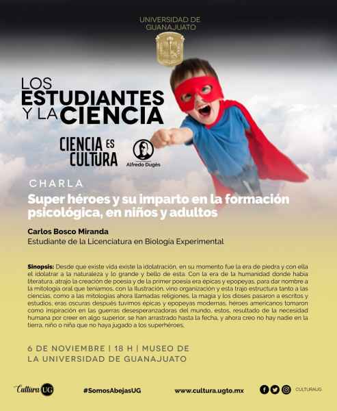 Carlos Bosco Miranda, alumno de la Licenciatura en Biología Experimental de la División de Ciencias Naturales y Exactas del Campus Guanajuato, impartirá la charla ‘Super héroes y su impacto en la formación psicológica, en niños y adultos’, a realizarse el 6 de noviembre del presente año e iniciando a las 18:00 horas en el Museo de la Universidad de Guanajuato (MUG)