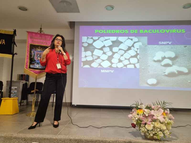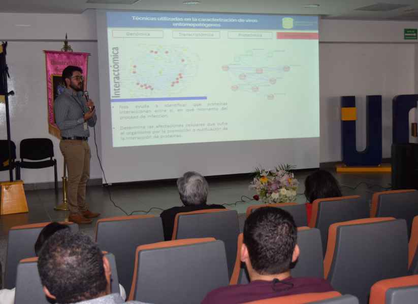 La Dra. María Cristina del Rincón Castro, profesora de la División de Ciencias de la Vida inició los trabajos al hablar de las generalidades de los baculovirus como agentes de control, ya que estos son una familia de virus infectivos para insectos o artrópodos.
