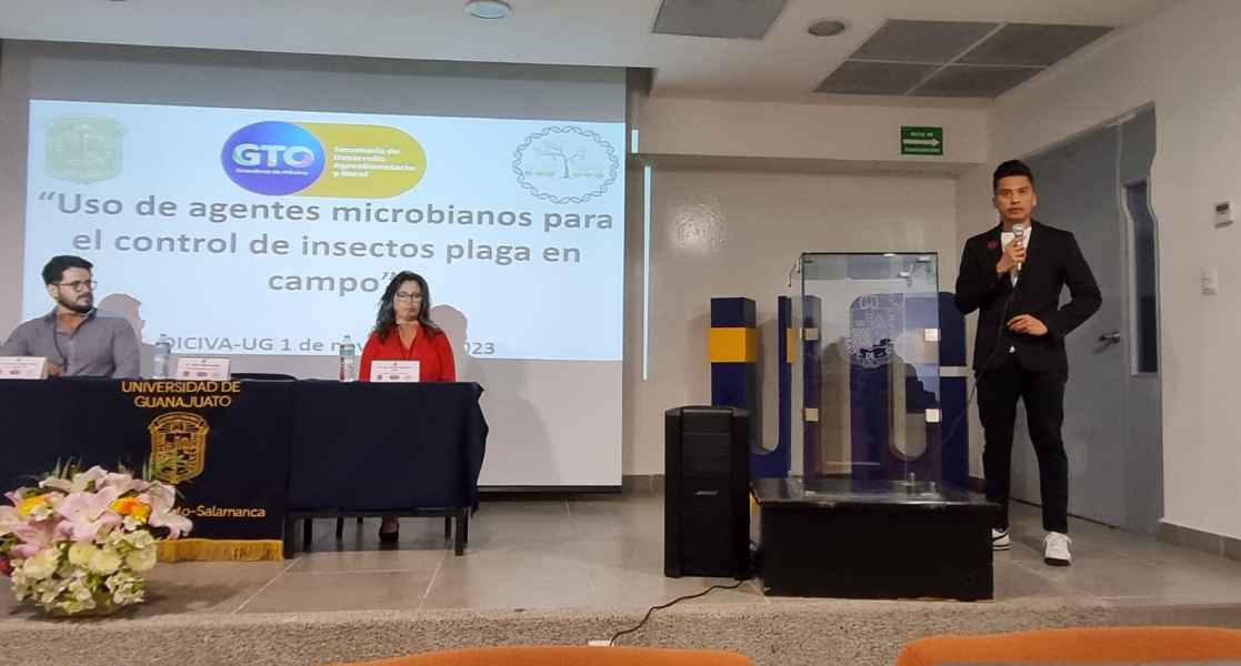 Irapuato, Gto. a 08 de noviembre de 2023.- En colaboración entre la academia, el gobierno y diversas empresas, se realizó el taller estatal “Uso de agentes microbianos para el control de insectos plaga en el campo”, en la División de Ciencias de la Vida de la Universidad de Guanajuato (UG).