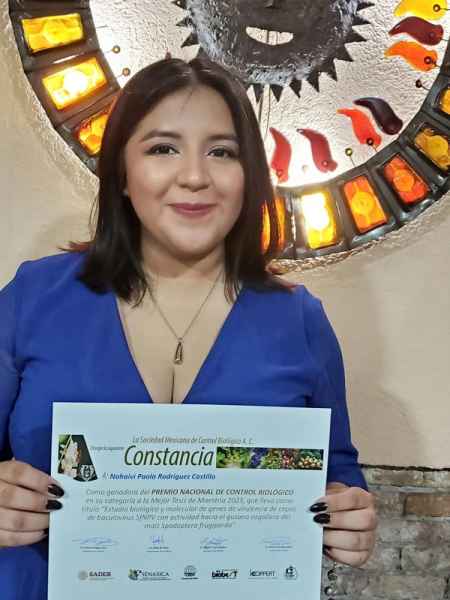 Irapuato, Gto. a 9 de noviembre de 2023.- Nahaivi Paola Rodríguez Castillo, alumna del Doctorado en Biociencias en la División de Ciencias de la Vida de la Universidad de Guanajuato (UG), ganó el Premio Nacional de Control Biológico en la categoría Mejor Tesis de Maestría 2023, que le otorgó la Sociedad Mexicana de Control Biológico A.C.
