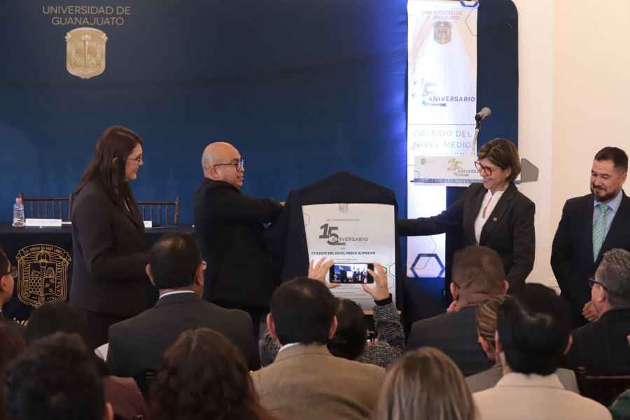 Guanajuato, Gto., a 16 de noviembre de 2023.- El Colegio del Nivel Medio Superior (CNMS) de la Universidad de Guanajuato (UG) realizó una ceremonia conmemorativa por el XV aniversario de su creación, la cual se deriva de la Ley Orgánica que confirió a la UG una estructura orgánica departamental y de multicampus.