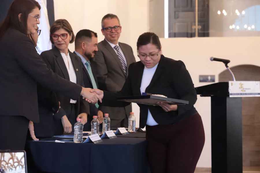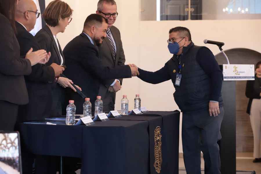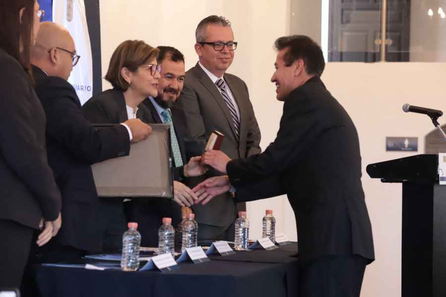Durante la ceremonia, se develó una placa conmemorativa y se hizo entrega de un reconocimiento al Mtro. Dionisio Alejandro Morales Zúñiga, a Gertrudis Rodríguez Palomino, y al Mtro. José Enrique Delgado Aguilar, quienes formaron parte de los inicios del CNMS.