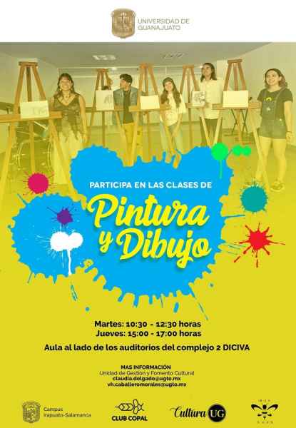 En el Campus Irapuato-Salamanca las clases de pintura y dibujo continúan sus actividades a un costado de los auditorios de la DICIVA, esto los martes de 10:30 a 12:30 horas y los jueves de 15:00 a 17:00 horas, mayores informes en el correo electrónico Esta dirección de correo electrónico está protegida contra spambots. Usted necesita tener Javascript activado para poder verla..