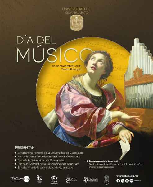 En el marco del Dia del Musico, la Universidad de Guanajuato (UG) a través de su Estudiantina Femenil, de su Rondalla Santa Fe, la Rondalla Señorial, acompañados del Coro y de la Estudiantina UG, ofrecerán un espectáculo el 22 de noviembre en el Teatro Principal.
