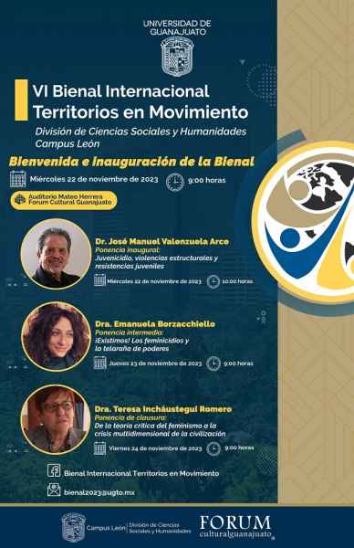 Como parte de las conferencias magistrales participan el Dr. José Manuel Valenzuela Arce con el tema “Juvenicidio, violencias estructurales y resistencias juveniles”; la Dra. Emanuela Borzacchiello presentará “¡Existimos! Los feminicidios y la telaraña de poderes”; así como la Dra. Teresa Incháustegui Romero, quien hablará “De la teoría crítica del feminismo a la crisis multidimensional de la civilización”. Para más detalles se puede consultar la página de FB: Bienal Internacional Territorios en Movimiento.