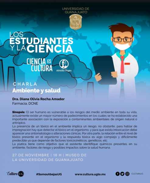 El programa “Ciencia es Cultura” brindará la charla “Ambiente y Salud” este 27 de noviembre a las 18:00 horas en el Museo de la UG (MUG) a cargo de la Dra. Diana Olivia Rocha Amador adscrita al Departamento de Farmacia del Campus Guanajuato.
