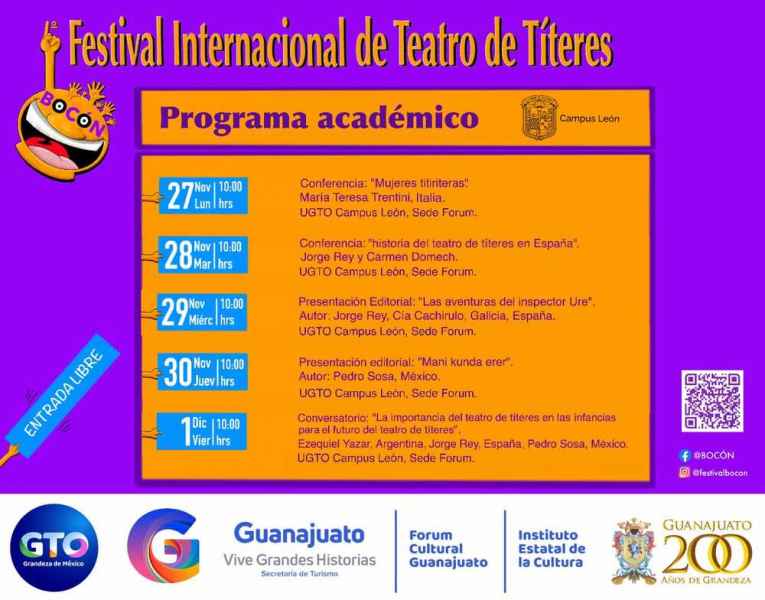 En el Campus León, del 27 de noviembre al 1 de diciembre, se realizará el Primer Festival Internacional de Teatro de Títeres Bocón, el cual engloba diversas actividades académicas que tendrán cabida a partir de las 10:00 horas en la Sede Forum, ubicada en Calzada de los Héroes #908 en colonia La Martinica.