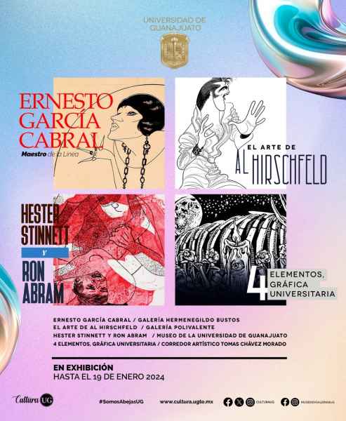 Continúan las exposiciones en los espacios de arte de la UG: “4 Elementos: Gráfica Universitaria” en la Galería Tomás Chávez Morado; “Al Hirschfeld – Leyenda en Línea” en la Galería Polivalente; “Ernesto García Cabral - Maestro de la línea” en la Galería Hermenegildo Bustos; y “Lo Personal se Imprime” de Hester Stinnett y Ron Abram en el Museo de la UG.
