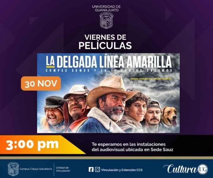 En el Campus Celaya – Salvatierra, se exhibirá la película mexicana “La Delgada Línea Amarilla” del director Celso R. García, el 30 de noviembre a las 15:00 horas en el Salón Audiovisual de la Sede Sauz con acceso gratuito. Por otro lado, el Curso de Invierno para aprender el idioma inglés prepara la recepción de inscripciones al curso correspondiente a diciembre 2023 – enero 2024, para obtener mayores informes consultar la página de Facebook de la Unidad de Vinculación y Extensión del campus @vinculacionccs