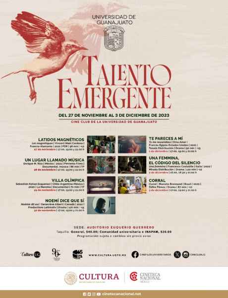 Del 27 de noviembre al 3 de diciembre, el Cine Club UG presenta el ciclo fílmico “Talento Emergente” que exhibirá siete producciones, entre largometrajes y documentales, “Latidos magnéticos” (2021) del director Vincent Maël Cardona será la función inaugural, que comenzará a las 17:00 horas en el auditorio Euquerio Guerrero. Además, en su modalidad virtual, “Cine en Línea” trae el ciclo “Luces Neófitas” que ofrece ocho películas, todas ellas disponibles hasta el 10 de diciembre en la página web www.cultura.ugto.mx.