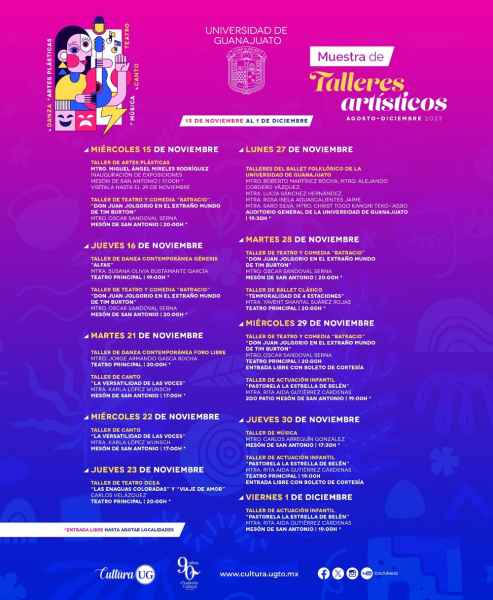 Dentro de la Muestra de los Talleres Artísticos de la UG, el Taller del Ballet Folklórico de la UG se presentará el 27 de noviembre a las 19:30 horas en el Auditorio General de esta Casa de Estudios, además el Taller de Teatro y Comedia “Batracio” dará una muestra este 28 de noviembre en el Mesón de San Antonio y el 29 de noviembre en el Teatro Principal ambas funciones serán a las 20:00 horas.