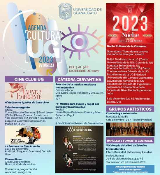 También, dará inicio la 22° Semana de Cine Alemán, mismo que proyectará ocho películas desde el 4 al 7 de diciembre en el auditorio Euquerio Guerrero. Del mismo modo, “Cine en Línea” continua la muestra cinematográfica virtual “Luces Neófitas” hasta el 10 de diciembre, para consultar la cartelera de ambos ciclos cinematográficos visitar el sitio web www.cultura.ugto.mx.