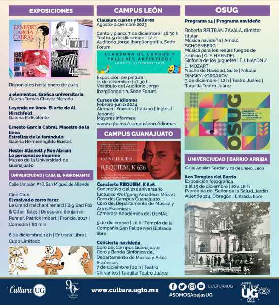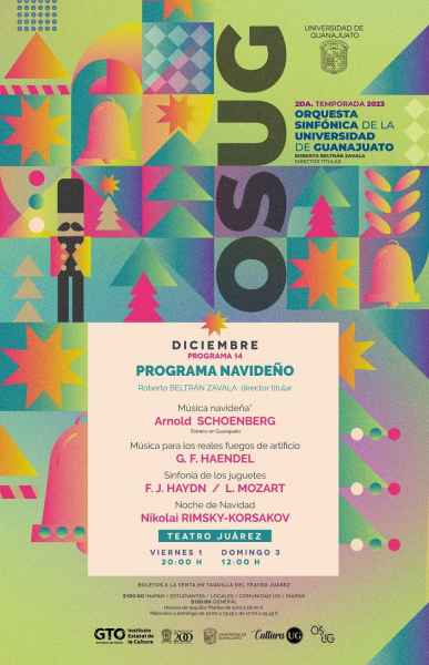 La Orquesta Sinfónica de la UG (OSUG) da la bienvenida a los festejos decembrinos con el “Concierto Navideño” que incluirá composiciones de Franz Joseph Haydn y de Nikolái Rimski-Kórsakov, el 3 de diciembre a las 12:00 horas en el Teatro Juárez, mientras que la Rondalla Santa Fe UG celebrará su 52° aniversario con un concierto sobre el escenario del Teatro Principal, el próximo 5 de diciembre a las 20:00 horas.