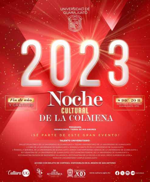 Guanajuato, Gto., a 01 de diciembre de 2023.- Los grupos artísticos de la Universidad de Guanajuato (UG) como el Ballet Folklórico; el Teatro Universitario; el Coro; las Rondallas Señorial y Santa Fe; Danza Contemporánea Génesis; las Estudiantinas; y el Mariachi Universitario del Campus Guanajuato encabezarán la “Noche Cultural de La Colmena” este 8 de diciembre a las 20:00 horas en el Auditorio del Estado de la ciudad de Guanajuato.