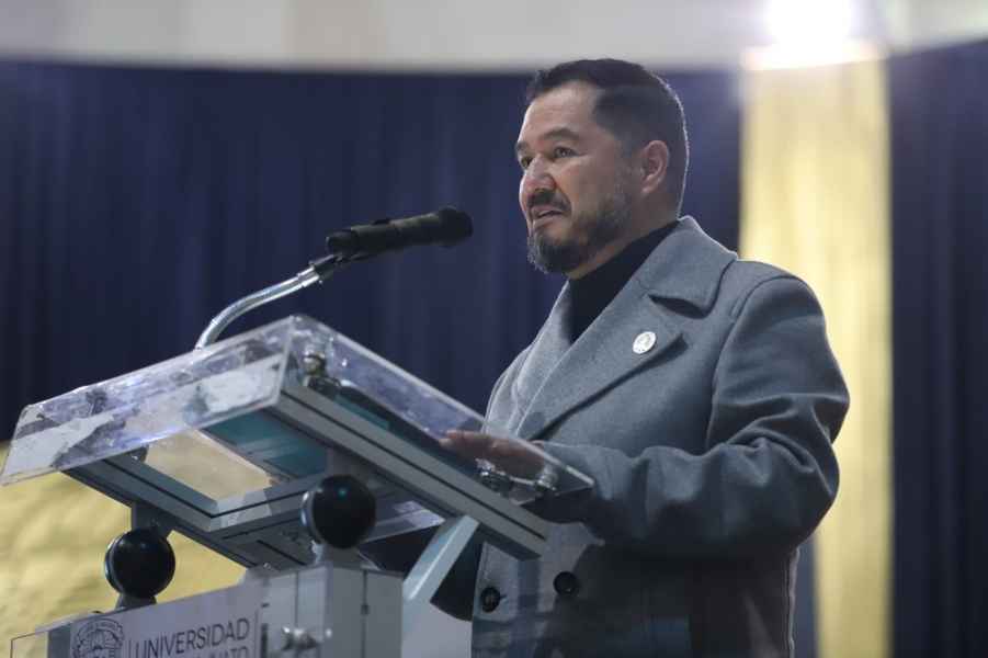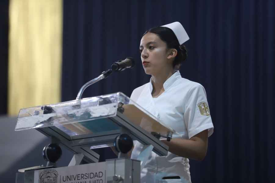 En el acto, que tuvo lugar en el Auditorio General de la Universidad de Guanajuato, en representación de la Dra. Claudia Susana Gómez López, Rectora de esta Casa de Estudios, el Secretario General, Dr. Salvador Hernández Castro, felicitó a las y los egresados de tan noble carrera, y expresó que este evento es de gran importancia para la Institución, pues el tema de la salud es una de las tres líneas que se revisaron durante la 3° conferencia sobre educación a nivel mundial.