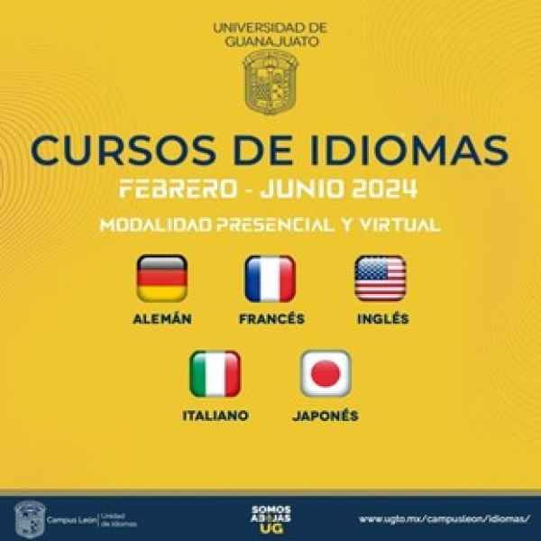 En cuanto a los cursos de idiomas en: alemán, francés, italiano, inglés y japonés a cursarse de febrero a junio 2024, Campus León convoca a personas interesadas en estudiar algún idioma, a participar en el proceso de inscripción. Para más detalles consultar la página www.ugto.mx/campusleon/idiomas/inscripciones.