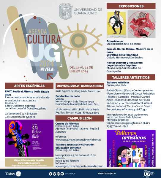 Guanajuato, Gto., a 12 de enero de 2024.- La Universidad de Guanajuato (UG) inicia sus actividades culturales con invitación abierta a su comunidad universitaria y sociedad en general a participar en las diferentes actividades que se desarrollan. En este calendario las personas podrán encontrar alternativas que van desde la apreciación del arte, la oportunidad de inscribirse a cursos y talleres, como un acercamiento a actividades recreativas en comunidad en espacios con identidad como el Barrio Arriba de León.