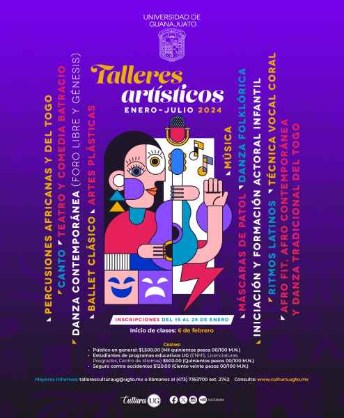 Guanajuato, Gto., a 19 de enero de 2024.- Con una gama de talleres artísticos culturales, cursos de educación continua y un festival que mezcla la ópera y el piano, darán inicio las actividades culturales de la Universidad de Guanajuato (UG), para esta semana.
