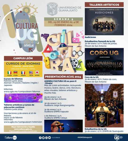 Guanajuato, Gto., a 26 de enero de 2024.- Más de mil actividades culturales integradas por música, teatro, danza, cine, literatura, artes visuales, talleres artísticos y mucho más, se realizarán en la Universidad de Guanajuato (UG) durante este 2024. No te pierdas la presentación la Agenda Cultura UG, esfuerzo institucional que conjunta la diversidad de actividades culturales y artísticas de la Dirección de Extensión Cultural, los cuatro Campus Universitarios, las Escuelas del Nivel Medio Superior y dependencias administrativas.