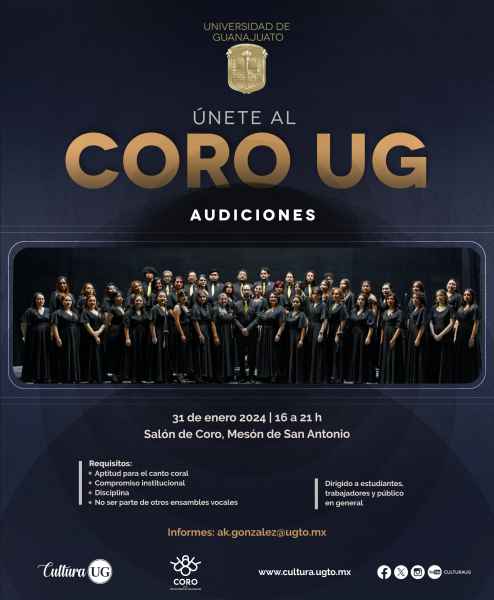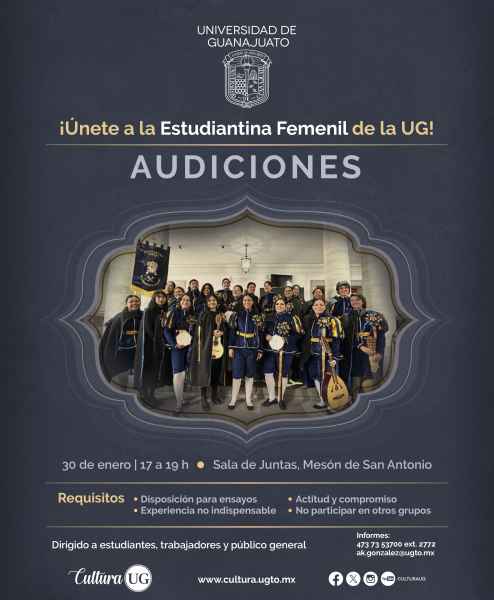 Además, las personas interesadas en formar parte de los grupos artísticos UG, iniciarán las audiciones para la Estudiantina Femenil de la UG este 30 de enero a las 17:00 horas en la Sala de juntas del Mesón de San Antonio; por su parte el Coro de la UG las realizará este 31 de enero a las 16:00 horas en el Salón de coro en el Mesón de San Antonio y el mismo día, pero a las 17:00 horas en la ENMS de Guanajuato la Estudiantina de la UG.