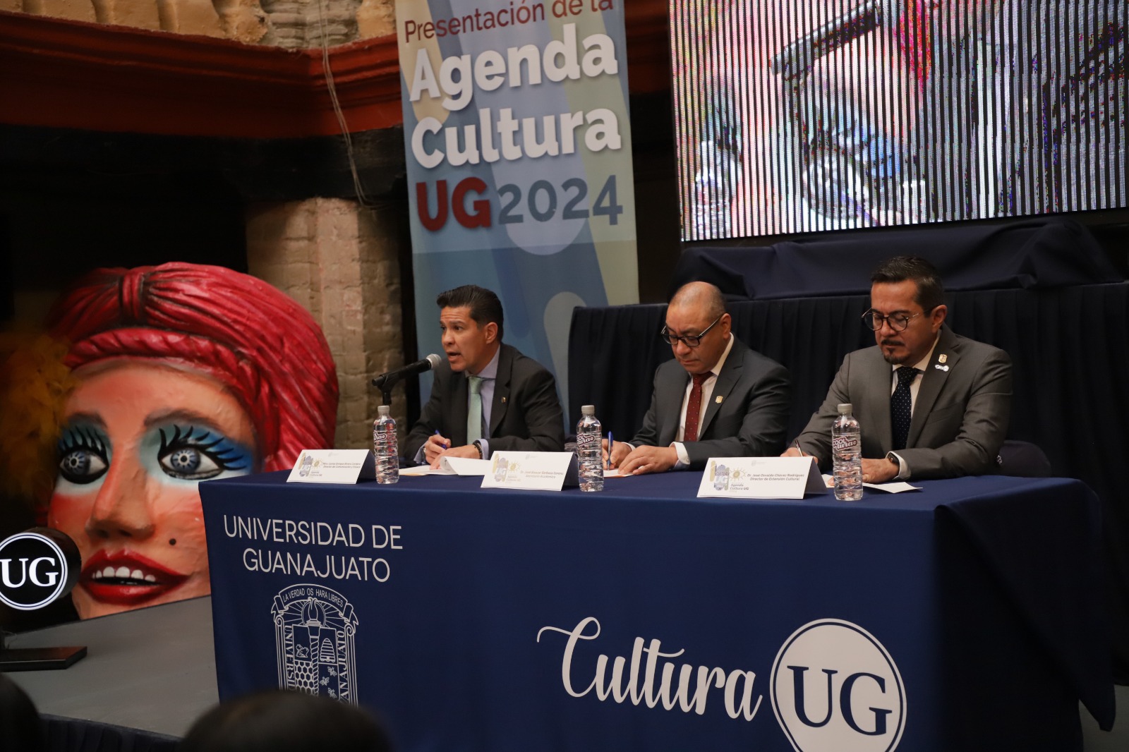 Guanajuato, Gto., a 29 de enero de 2024.- Con un viaje por la música, teatro, danza, cine, literatura, artes visuales, talleres artísticos y mucho más, la Universidad de Guanajuato (UG) presentó la Agenda Cultura UG 2024, compendió de actividades de los grandes proyectos de impulso a la creación, promoción y extensión artística y cultural, a desarrollarse a lo largo del año en las distintas sedes universitarias.