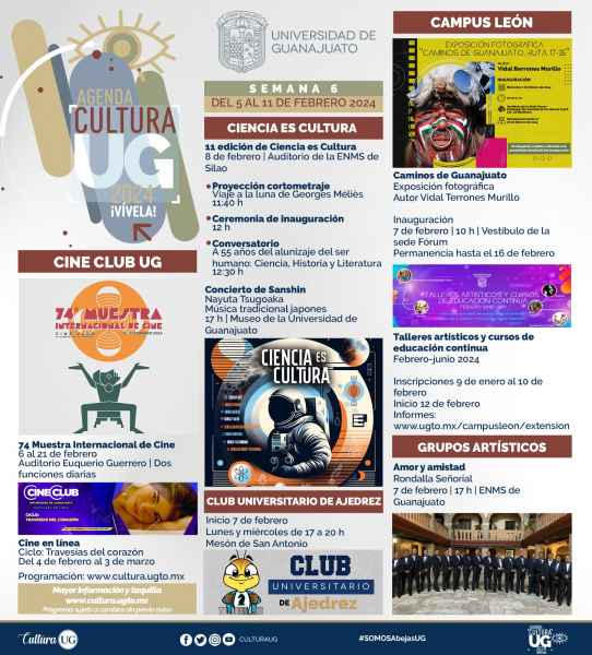 Guanajuato, Gto., a 02 de febrero de 2024.- Proyección de cortometrajes, música, cine, fotografía, talleres artísticos, cursos de educación continua y ajedrez, son la mezcla perfecta para iniciar la Agenda Cultura UG (ACUG) que se realizará del 5 al 11 de febrero 2024 en la Universidad de Guanajuato (UG).