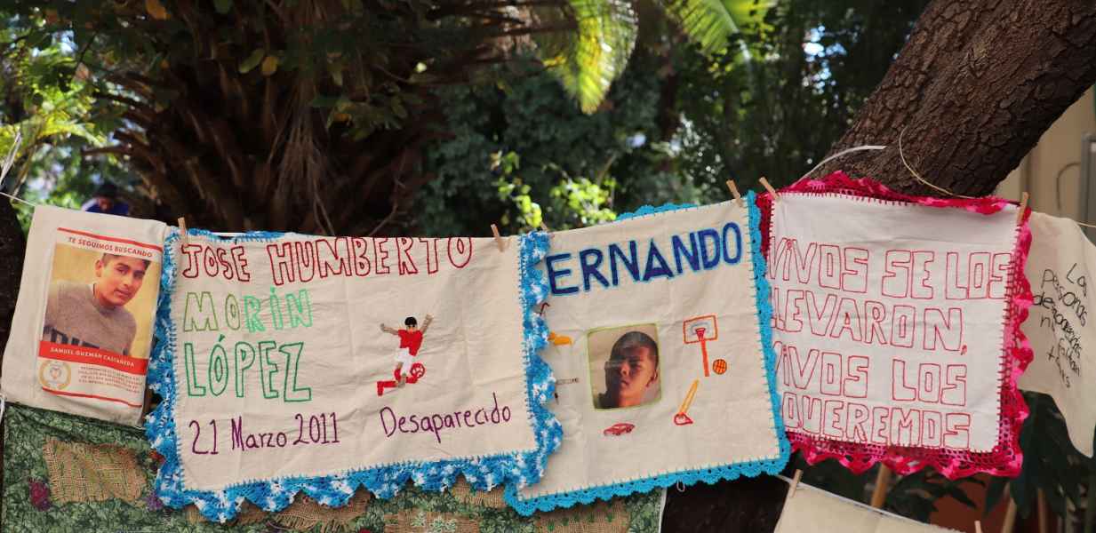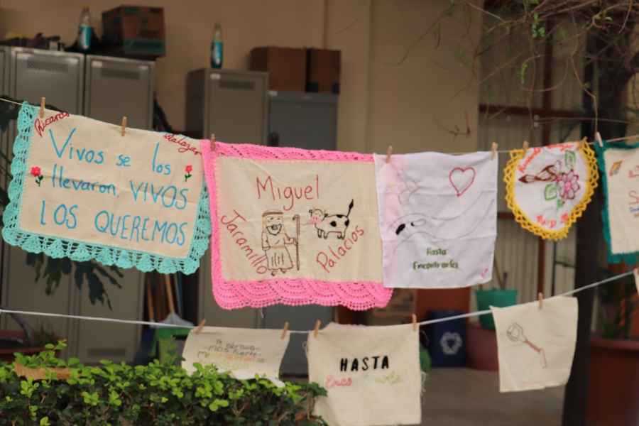En uno de los telares se podía leer: “En los últimos 4 años, se ha quintuplicado el número de personas desaparecidas en Guanajuato, al mismo tiempo que suben los homicidios y hallazgos de fosas clandestinas. Hay más de 1,500 cuerpos sin identificar que esperan para ser reconocidos, ya sea en el panteón forense o en fosas comunes. Sus familias les buscan, les lloran…Aquí bordamos por la memoria, la verdad y la justicia. Bordamos Memoria".