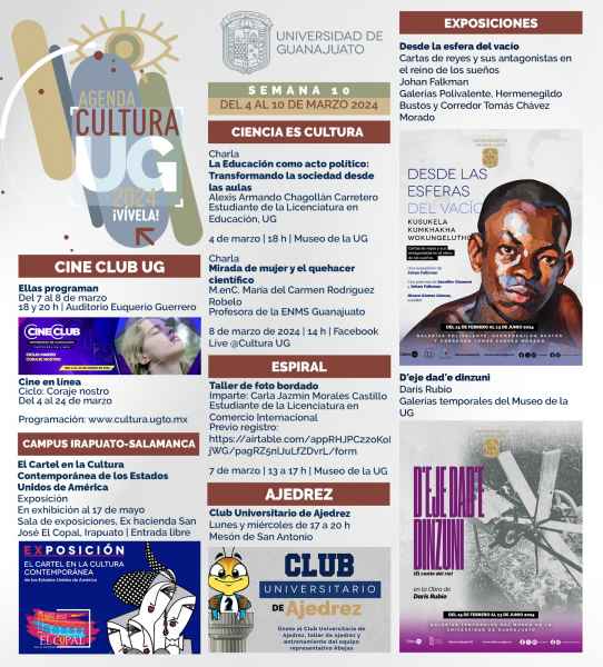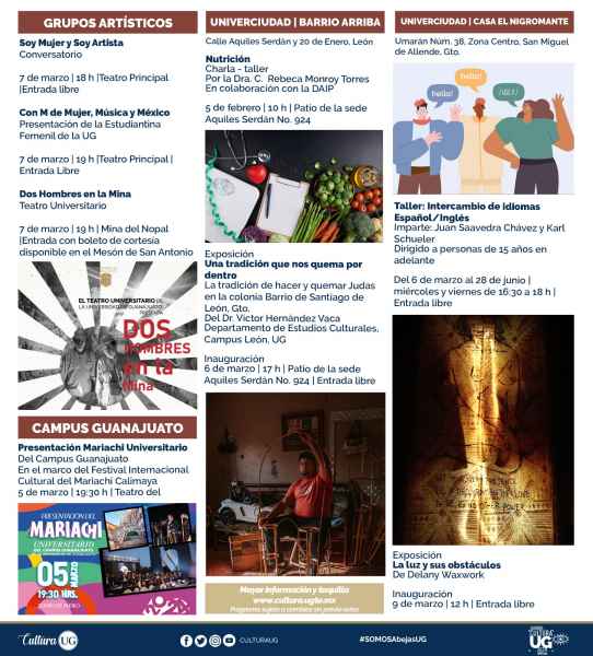 Guanajuato, Gto., a 01 de marzo de 2024.- Con charlas, talleres, cine, teatro, exposiciones y música, inicia la primera semana de marzo en la Agenda Cultural de la Universidad de Guanajuato (UG).