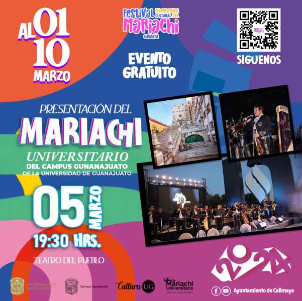 Del Campus Guanajuato, el Mariachi Universitario participará en el Festival Internacional Cultural del Mariachi Calimaya, en el Teatro del pueblo de Calimaya, en el Estado de México, ofreciendo un espectáculo con acceso libre el 5 de marzo a las 19:30 horas.