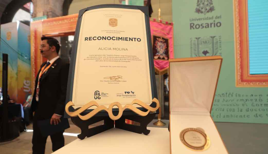Guanajuato, Gto., a 15 de marzo de 2024.- Alicia Molina Argudín fue galardonada con el VII Premio “Jorge Ibargüengoitia” de Literatura, otorgado por la Universidad de Guanajuato, debido a su admirable trayectoria como pionera en la Categoría de Literatura Infantil y Juvenil, género considerado por primera vez para este reconocimiento. La premiación se efectuó durante la inauguración de la 66ª Feria Internacional del Libro (FILUG) de dicha institución, celebrada este jueves 14 de marzo en el Antiguo Patio del Hospicio de la Santísima Trinidad.