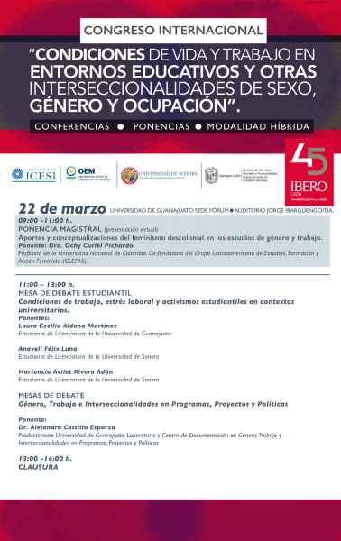 A través de ponencias y mesas de debate realizadas en modalidad híbrida, se analizarán las condiciones de vida y trabajo en entornos educativos y comunitarios con base en las interseccionalidades de sexo-género, ocupación y condición étnico racial, entre otras categorías. Así, se plantearán los contextos de desigualdad, y aspectos como la demanda de cuidados en el mundo de trabajo y otros escenarios.