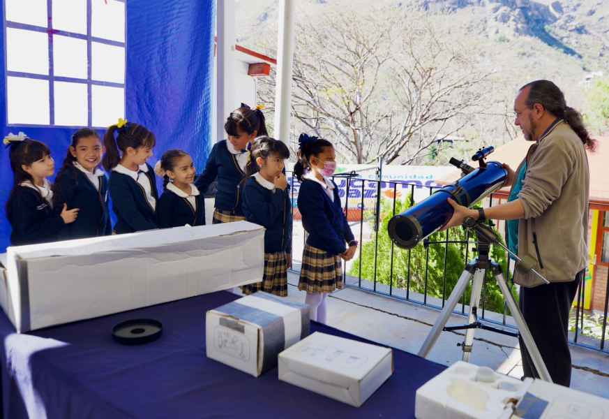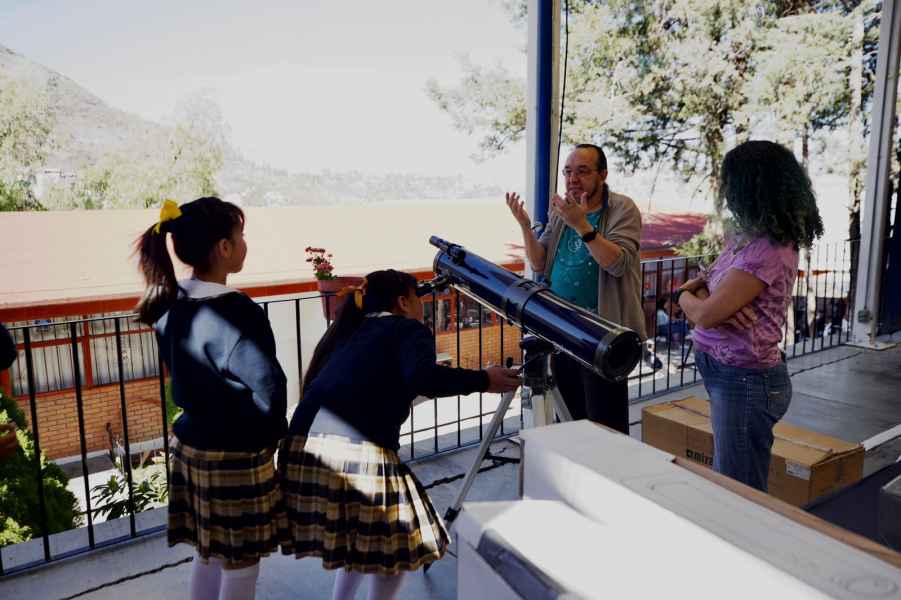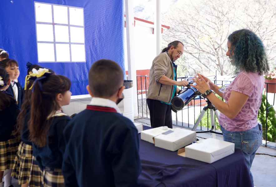 Por su parte, el profesor del Departamento de Astronomía Dr. César Caretta y la Dra. Elcia Souza quien también es profesora de Ingeniería Ambiental de la División de Ingenierías de la Sede Belén UG, se unieron a la jornada de exploración y promoción de conocimiento científico, con la instalación de un telescopio en el que se observaron diversos cuerpos celestes y con la realización de juegos didácticos sobre el cuidado del entorno natural, supervisados por la estudiante del doctorado en Ciencias del Agua UG Mónica Martínez, por la estudiante de la maestría en Ciencias del Agua UG Fátima Gómez Alcocer, acompañados por Cristofer Serratos González y por David Antonio Espinoza, estos últimos alumnos del sexto semestre de Ingeniería Ambiental UG.