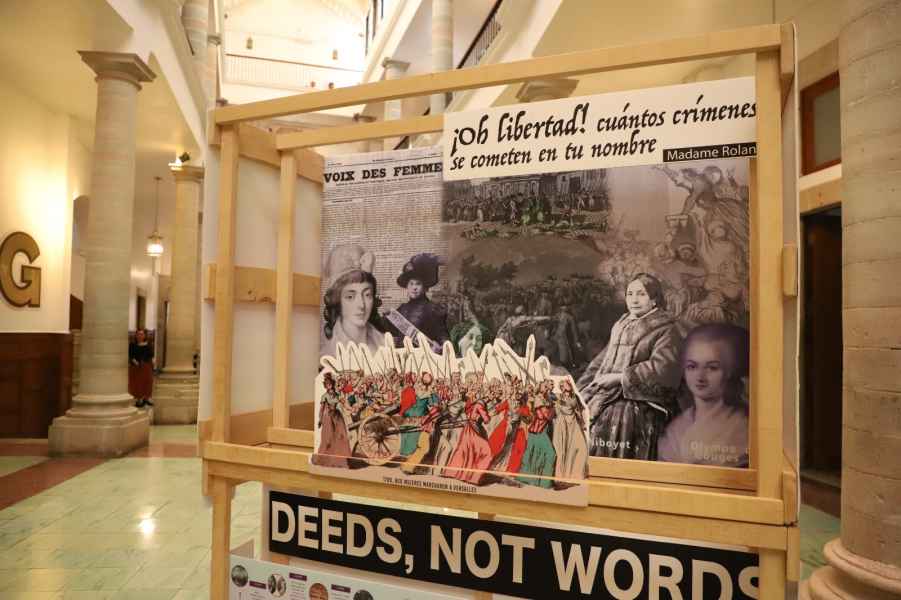 Guanajuato, Gto., a 17 de abril de 2024.- Con el objetivo de reflexionar sobre el papel crucial que las mujeres han desempeñado en la construcción y consolidación de la democracia a lo largo de la historia, fue montada la exposición "Mujeres y Democracia: historia ilustrada de la participación política de las mujeres", en el Patio de Estudios de la División de Derecho Política y Gobierno.