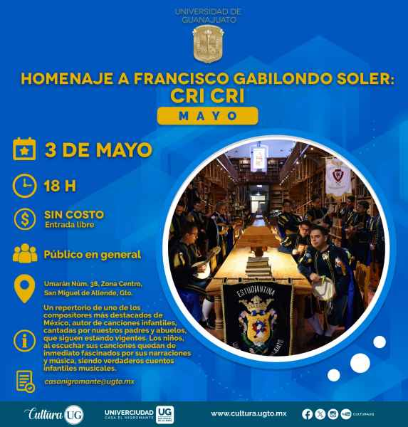 Con motivo del Dia del Niño, en la Univerciudad Casa El Nigromante de San Miguel de Allende, se efectuará un homenaje a Francisco Gabilondo Soles “Cri-Cri” por parte de la Estudiantina de la Universidad de Guanajuato el viernes 3 de mayo en punto de las 18:00 horas. Los boletos de cortesía se pueden adquirir en la taquilla de Casa El Nigromante de dicho municipio. También se realizará el “Café Literario” el día 30 de abril a las 16:30 horas con acceso gratuito a las y los aficionados a la lectura. Finalmente y en la misma sede, la exposición La luz y sus obstáculos De Delany Waxwork continuará en exhibición hasta el 17 de mayo y con entrada libre.