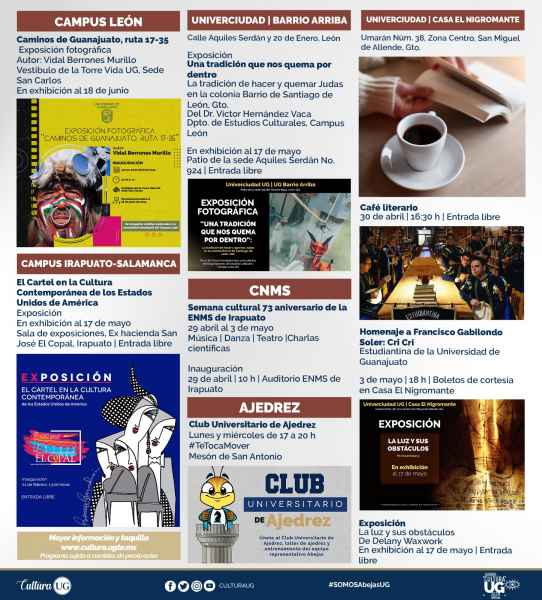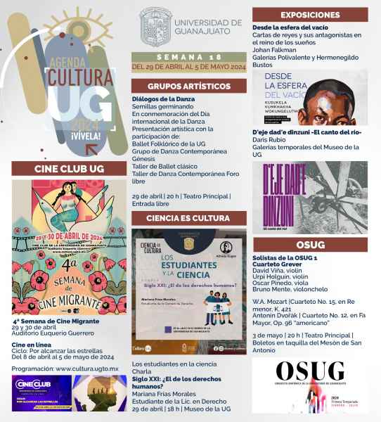 Los días 29 y 30 de abril, el Cine Club UG exhibirá la 4° Semana de Cine Migrante en el auditorio Euquerio Guerrero. Del mismo modo, Cine en Línea nos invita a disfrutar del ciclo “Por alcanzar las estrellas”, disponible del 8 de abril al 5 de mayo. Mayores informes y programación en la página www.cultura.ugto.mx.