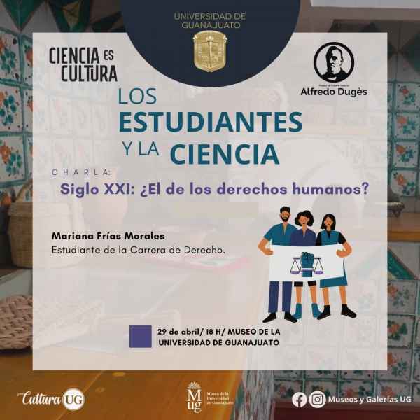 El programa “Ciencia es Cultura” abordará el eje temático “Los estudiantes en la ciencia” y pondrá en marcha la charla “Siglo XXI: ¿El de los derechos humanos?” a cargo de la estudiante de la Licenciatura en Derecho UG Mariana Frías Morales, lo anterior a celebrarse este 29 de abril a las 18:00 horas en el Museo de la UG.