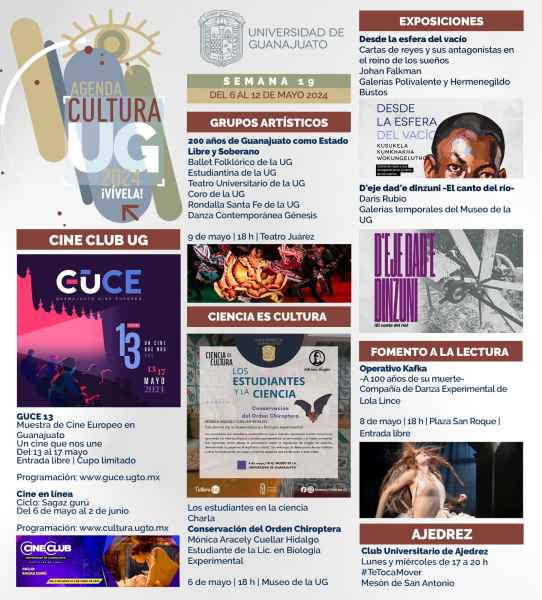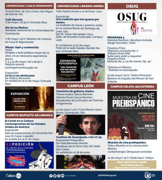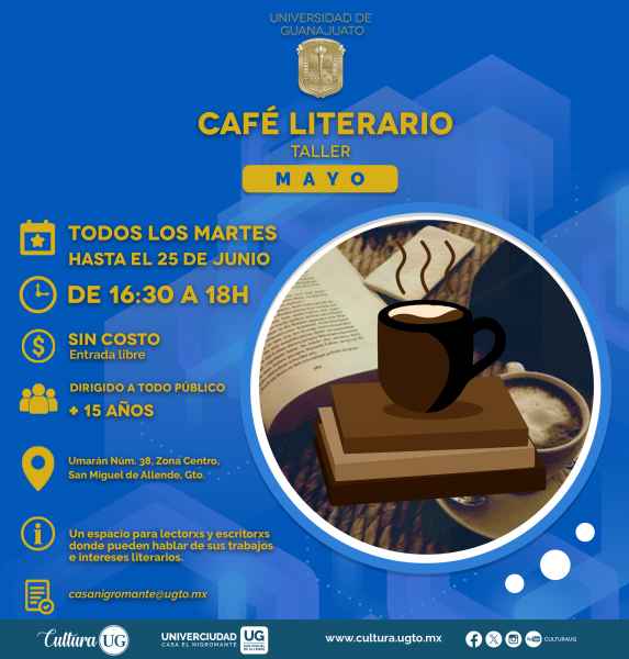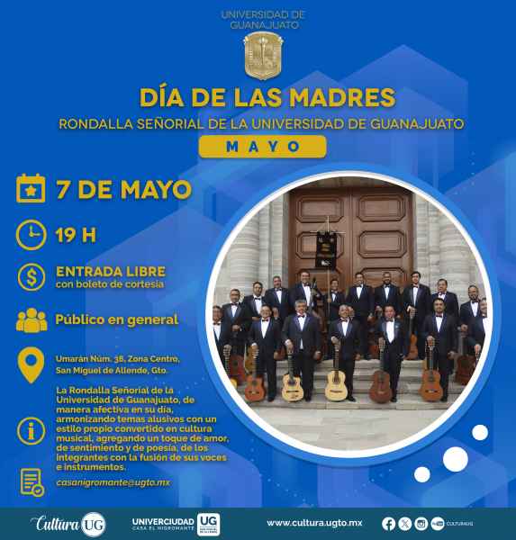 Mientras que, en Universidad, Casa el Nigromante en el municipio de San Miguel de Allende para las y los amantes de la lectura, se hace presente este 7 mayo, “Café literario” a las 16:30 horas; además este mismo día, a las 19:00 horas se presentará la Rondalla Señorial de la UG con un hermoso concierto en el marco del Día de las madres.