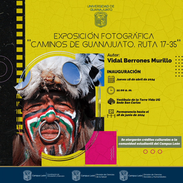 En Campus León continúa la exposición fotográfica “Caminos de Guanajuato ruta 17-35”, de Vidal Berrones Murillo, en el Vestíbulo de la Torre Vida UG de la Sede San Carlos UG. Exhibición al 18 de junio.