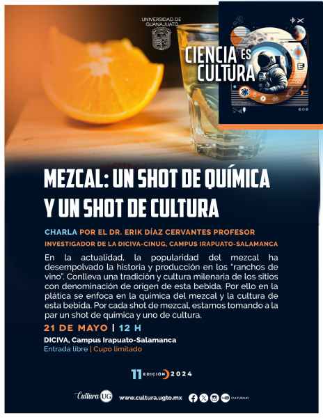 En Ciencias es Cultura, esta semana se abre a charlas que darán su toque científico a bebidas tradicionales, la moda, el arte y la salud desde la historia con charlas como: “Mezcal: un shot de química y un shot de cultura”, por el Dr. Erik Díaz Cervantes, profesor del Departamento de Alimentos en la División de Ciencias de la Vida (DICIVA) y el Centro Interdisciplinario del Noreste de la UG. La cita es el próximo 21 de mayo a las 12:00 horas en la DICIVA del Campus Irapuato-Salamanca.
