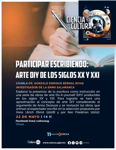 A través de FB Live: @culturaug, se presentan el Dr. Gonzalo Enrique Bernal Rivas, Profesor de la ENMS Salamanca, con la charla “Participar escribiendo: Arte DIY de los siglos XX y XXI” el próximo 22 de mayo a las 14:00 horas. Al igual que, Gabriela Arlen Macías Aguilar, estudiante de la Licenciatura en Historia con “Una perspectiva histórica de la sífilis y su tratamiento a finales del siglo XIX”, el 23 de mayo a las 16:00 horas.