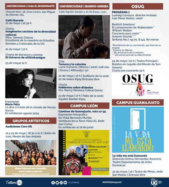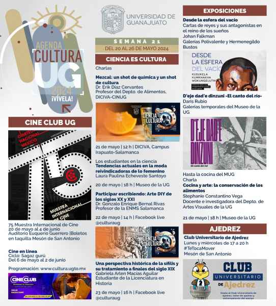 Guanajuato, Gto., a 17 de mayo de 2024.- Sé parte y disfruta de las actividades culturales que la Universidad de Guanajuato (UG) presenta en su Agenda Cultura UG (ACUG) semanal dirigida a la comunidad universitaria y sociedad, con presentaciones para los diversos gustos y experiencias que se extienden a lo largo de los espacios universitarios.