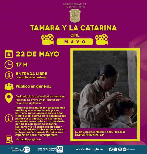 En León, Univerciudad “Barrio Arriba” (Calle Aquiles Serdán núm. 924 y 20 de Enero núm. 929) proyecta el filme mexicano “Tamara y la catarina” de Lucía Carreras, el próximo 22 de mayo a las 17:00 horas en el Auditorio de la Sede 20 de enero. Entrada libre. Para el 23 de mayo, se presenta la charla “Hablemos sobre diabetes” con la Dra. Nancy Verónica Cabral Quiroz, en el Patio de la Sede Aquiles Serdán, en punto de las 17:00 horas.