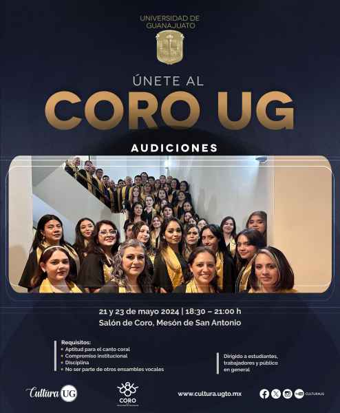 Es tu oportunidad para formar parte de unos de los grupos artísticos de la UG, este 21 y 23 de mayo asiste a las audiciones del Coro UG, en el Salón de coro ubicado en el Mesón de San Antonio de 18:30 a 21:00 horas