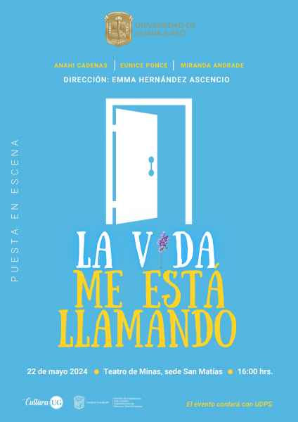 En actividades de los campus, desde Guanajuato el próximo 22 de mayo a las 16:00 horas, estudiantes del Departamento de Música y Artes Escénicas de la UG (DEMUG) presentarán “La vida me está llamando” bajo la dirección de Emma Hernández Ascencio, en el Teatro de Minas, de la Sede San Matías. Entrada libre.