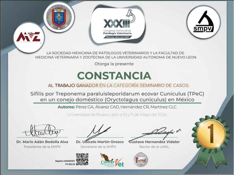 En el congreso se efectuó en Monterrey, Nuevo León, el profesor presentó el estudio “Sífilis por Treponema paraluisleporidarum ecovar Cuniculus (TPeC) en un conejo doméstico (Oryctolagus cuniculus) en México”, que repercutió en el reconocimiento de la Sociedad Mexicana de Patólogos Veterinarios y la Facultad de Medicina Veterinaria y Zootecnia de la Universidad Autónoma de Nuevo León (UANL).